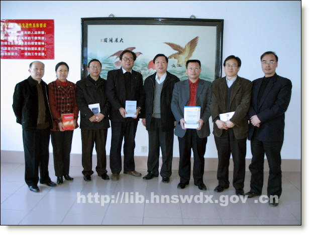 1月10日下午,我校5位教授向我馆赠送自己的著作。他们是:科学社会主义教研部何隆德教授,党史教研部戴安林教授,党建教研部肖湘教授、艾理生教授、陈平其教授。另外法学教研部周湘伟教授也委托教研部秘书向图书馆赠送了自己的著作。我馆领导高兴地接受了他们的赠书。谢自强馆长代表图书馆向教授们表示衷心的感谢,热情称赞了他们关心图书馆事业的高尚行为、赞扬了他们为图书馆事业所做的贡献,并且希望他们以及全校的教职员工更多地关心图书馆的建设,支持图书馆的工作。