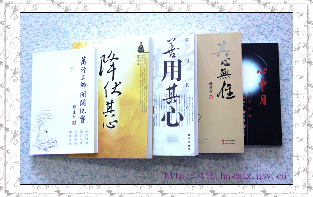 2013年5月27日,经原湖南大学退休教师赵美*倾情联系和推荐,广东省韶关市人大代表、韶关市海外联谊会副会长、韶关市宗教文化交流协会副会长、东华禅寺开山住持、方丈释万行向我馆赠送了一批个人佛学专著。该批著作包括《善用齐心》、《降服其心》《其心无住》、《万行上师闭关纪实》、《心中月》等五种各10册,共计50册。